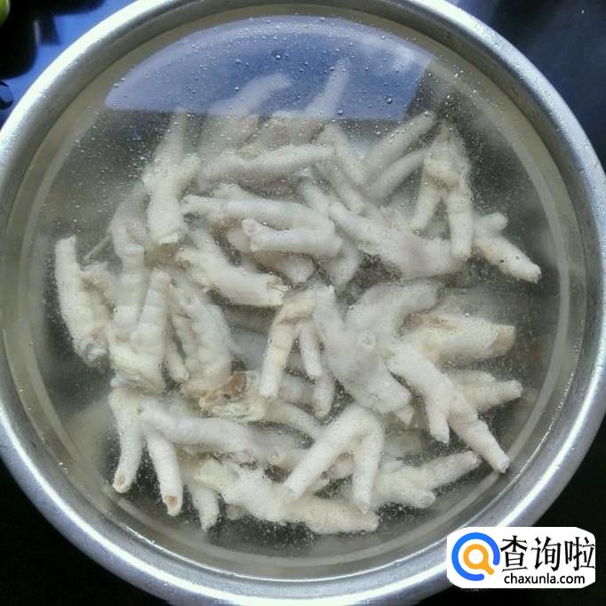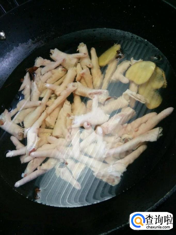 在锅里烧上水,倒入鸡爪,加生姜片和料酒放上锅盖煮到鸡爪熟就好,不能把鸡爪煮的太软,那样就没有了嚼劲