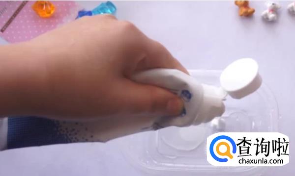 加入小半盒的胶水,并挤入一些护手霜,用勺子混合均匀。因为护手霜是粉红色的,所以这里我们就不用再额外添加颜色了。