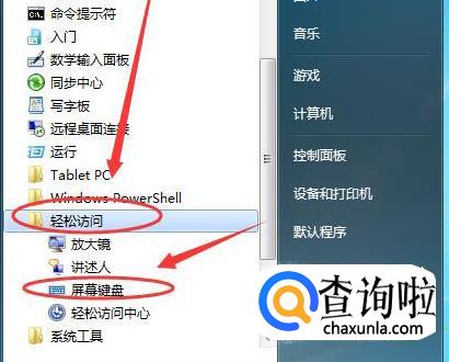 然后在附件文件夹中,点击“轻松访问”文件夹,里面就有“屏幕键盘”。