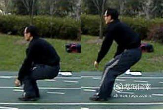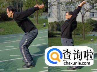 双手向后摆至极限,两腿弯曲呈马步状,双脚与肩同宽。