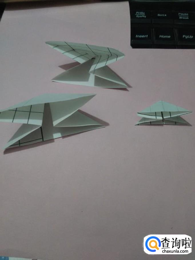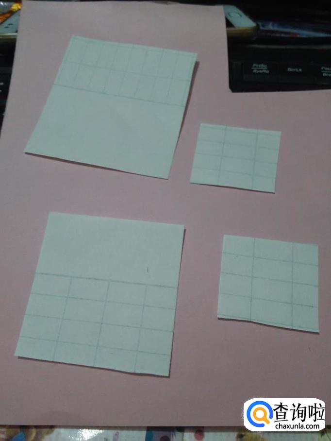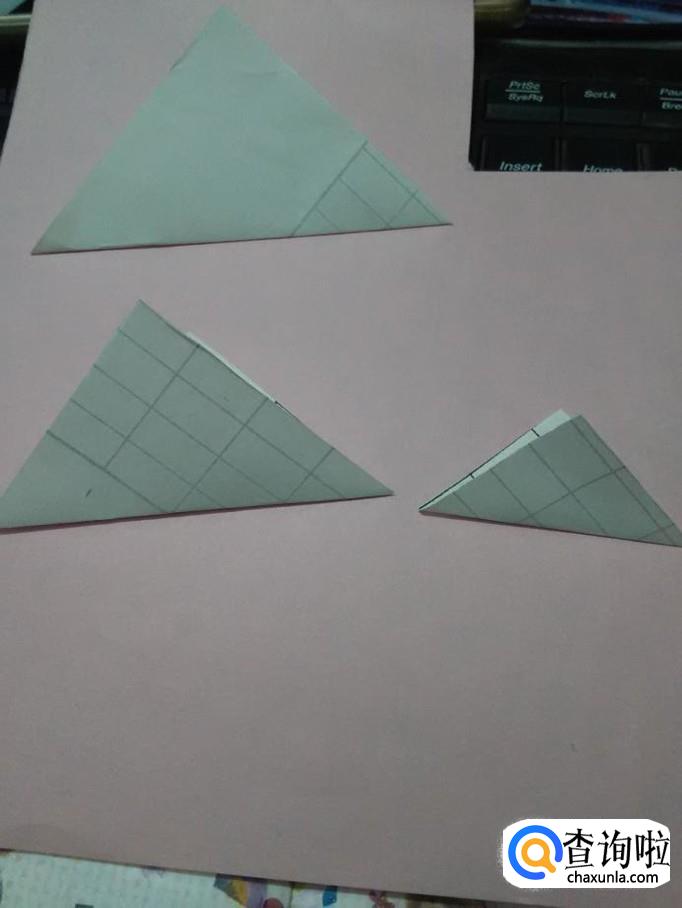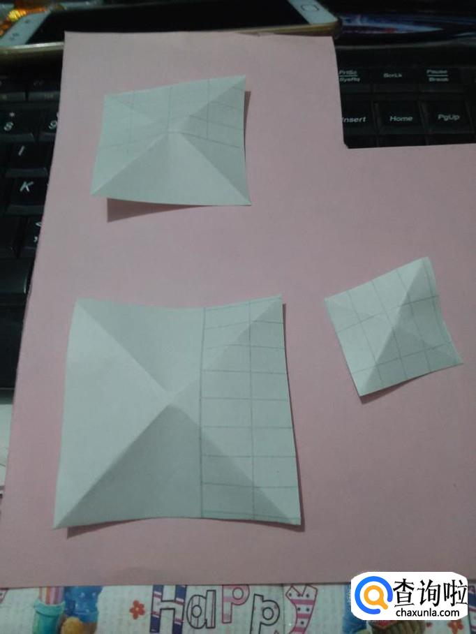 将一个最小的正方形放在一边,将其他三个正方形角与角对折,折出中间的两条线。