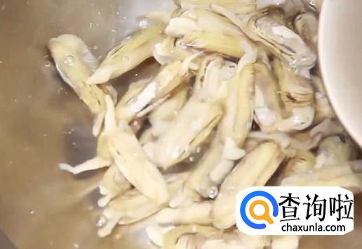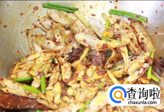 等味道几乎都出来了,开大火,倒入煮好的蛏子,爆炒