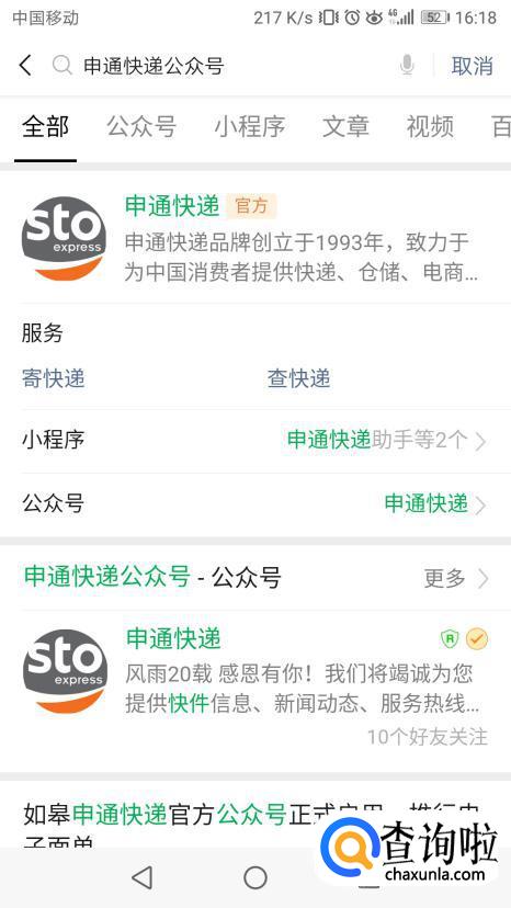 输入申通快递,找到官方公众号添加。