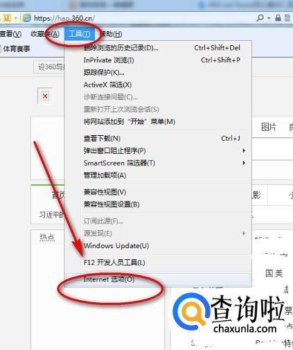 首先打开Internet浏览器,然后再点击菜单栏的“工具”,在弹出的下拉菜单中选择“Internet 选项”。