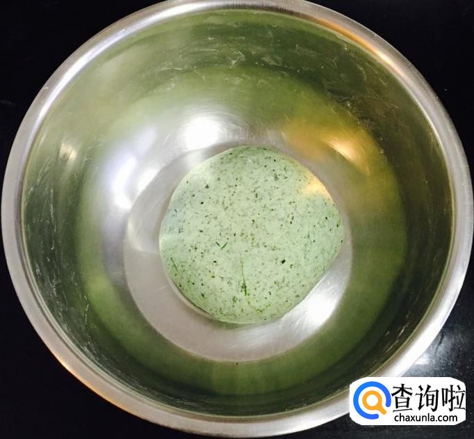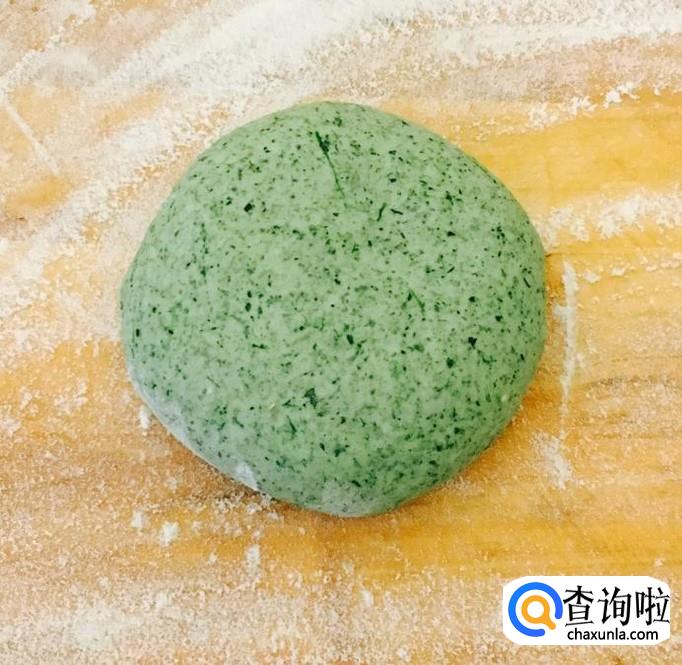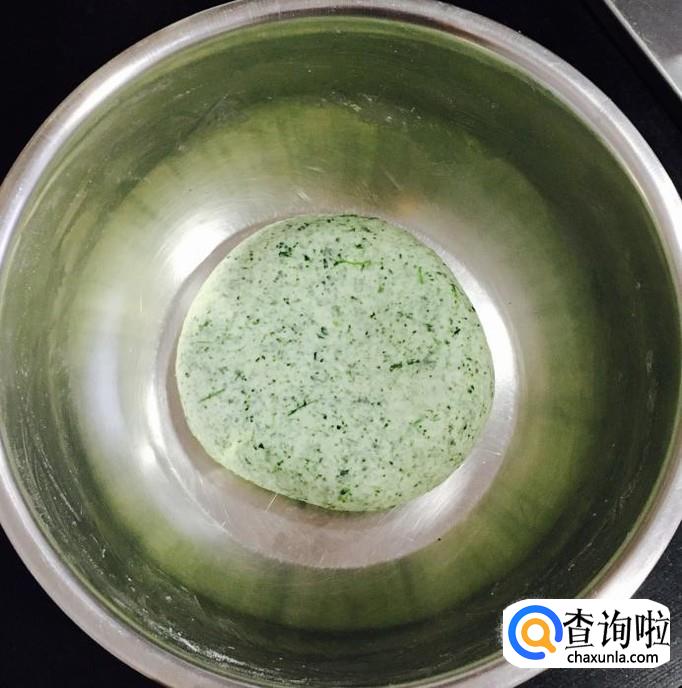 取适量的面粉放入容器中,把焯好水的菠菜取叶子也放入容器中