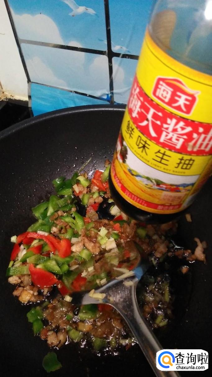 锅中留少许底油,将腌好的五花肉放入锅中翻炒均匀,炒至变色后,将葱末,姜末,蒜末,倒入锅中,翻炒均匀,再准备适量青红椒,切小块后放入锅中,和五花肉一起翻炒。
