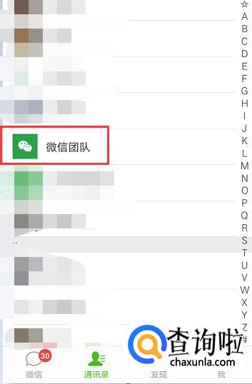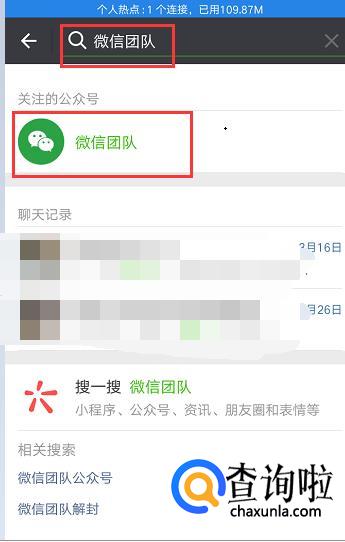 如果通讯录里没有的话,请回到主页面,点击上方的搜索。输入“微信团队”进行搜索,搜索出来后,点击“微信团队”进入。