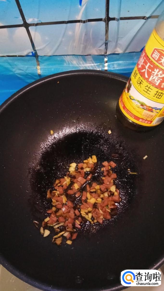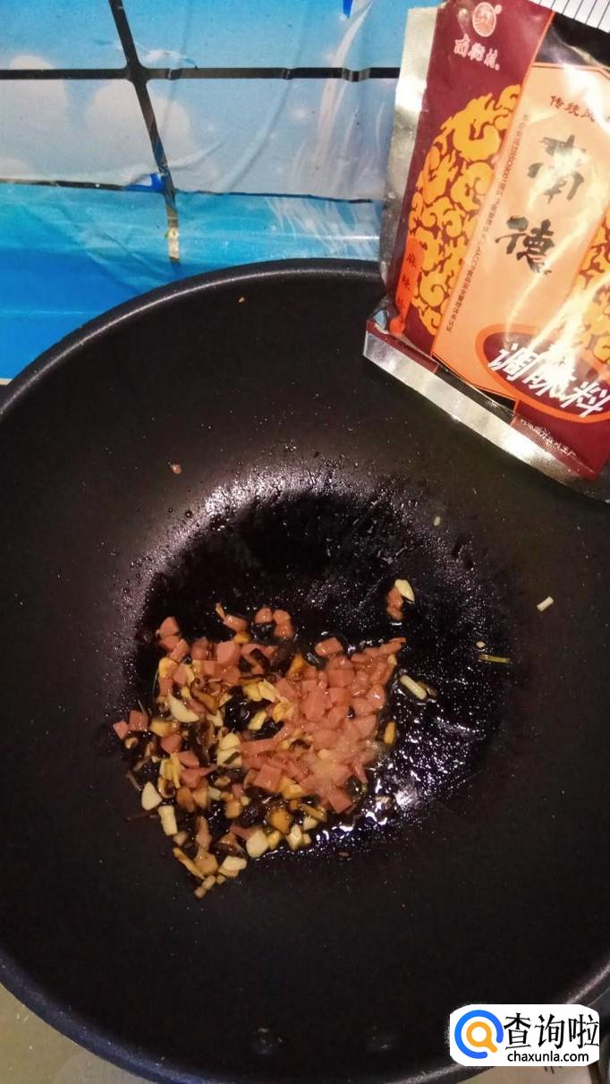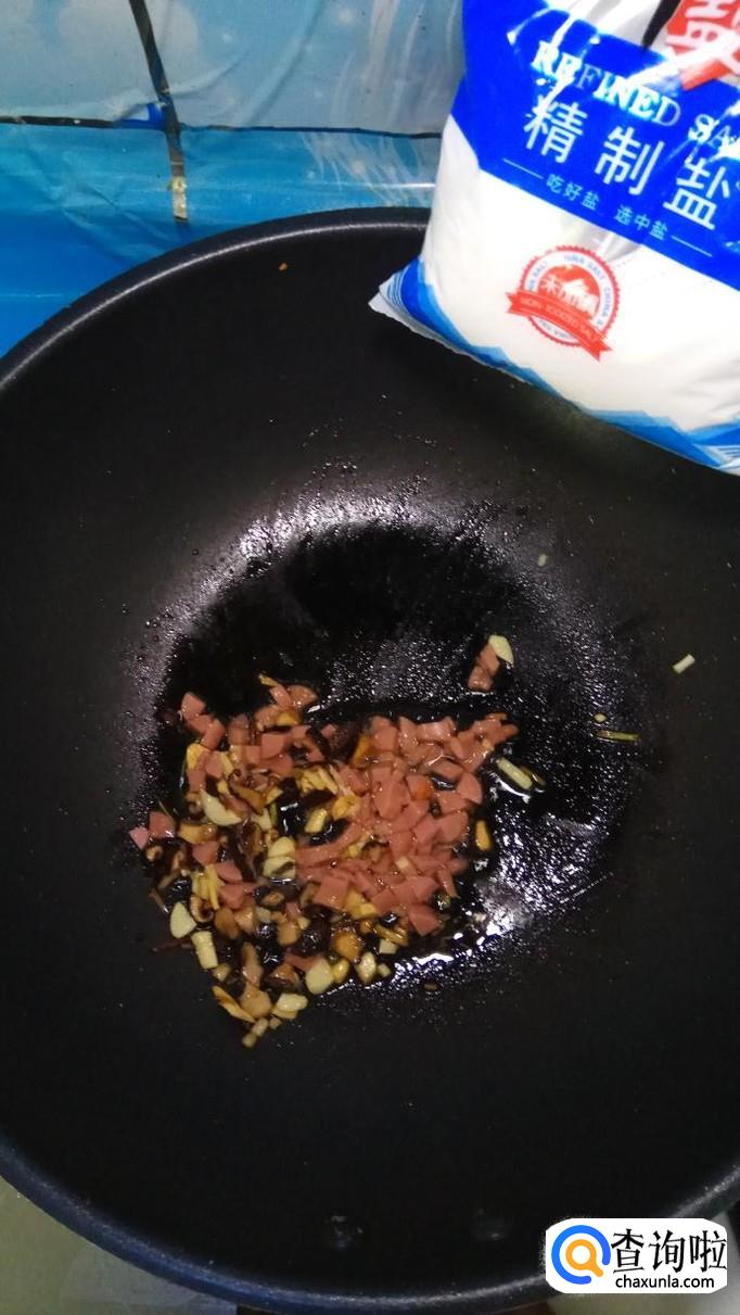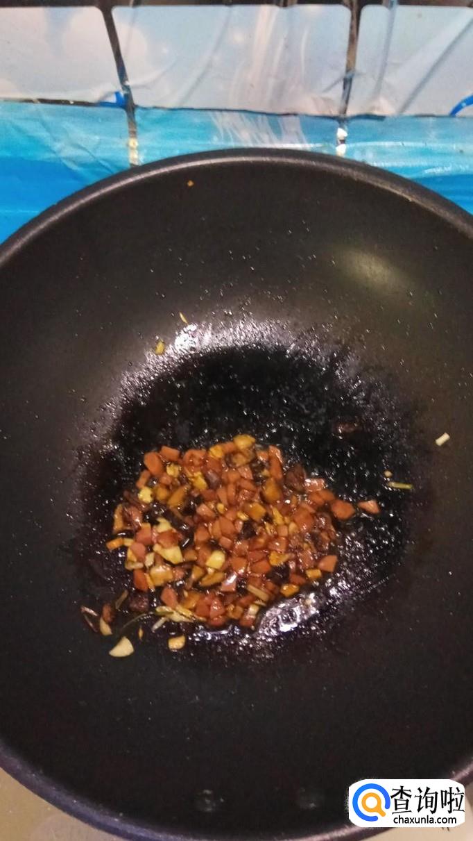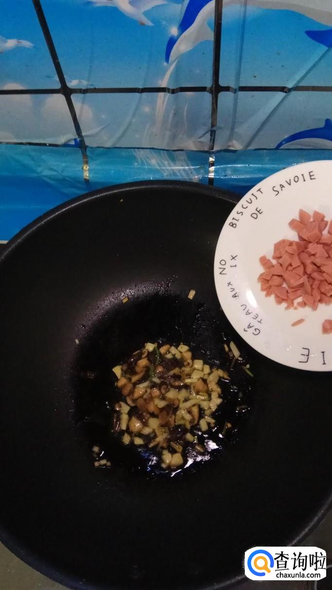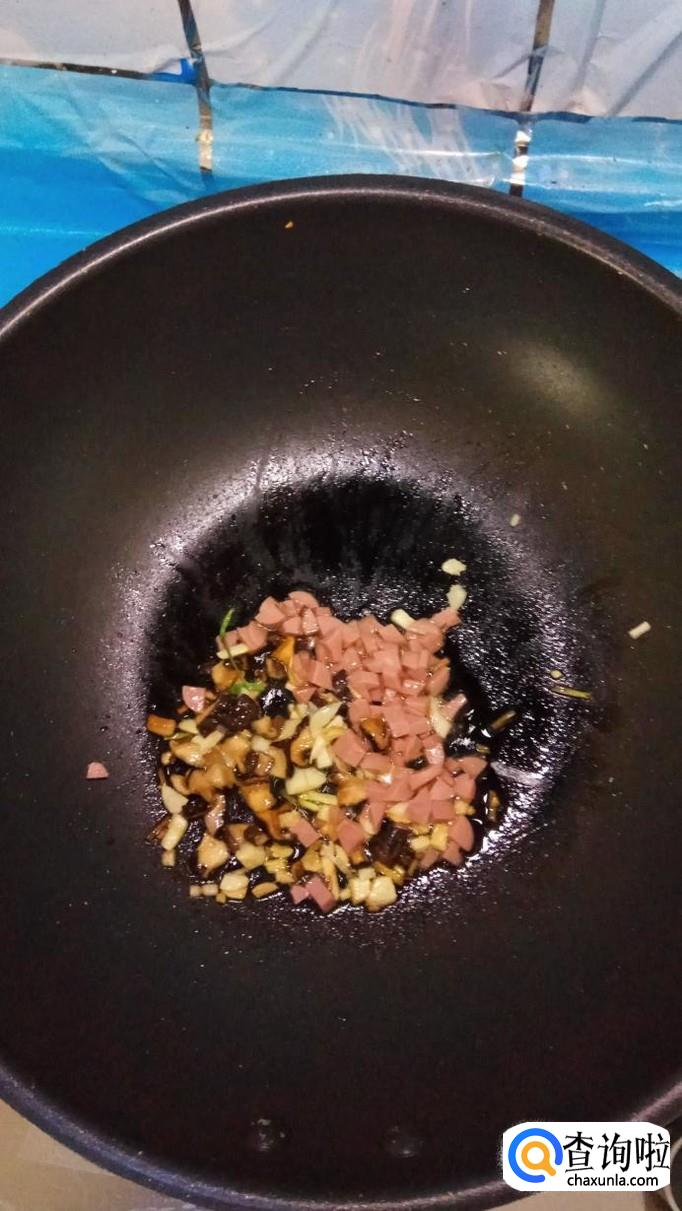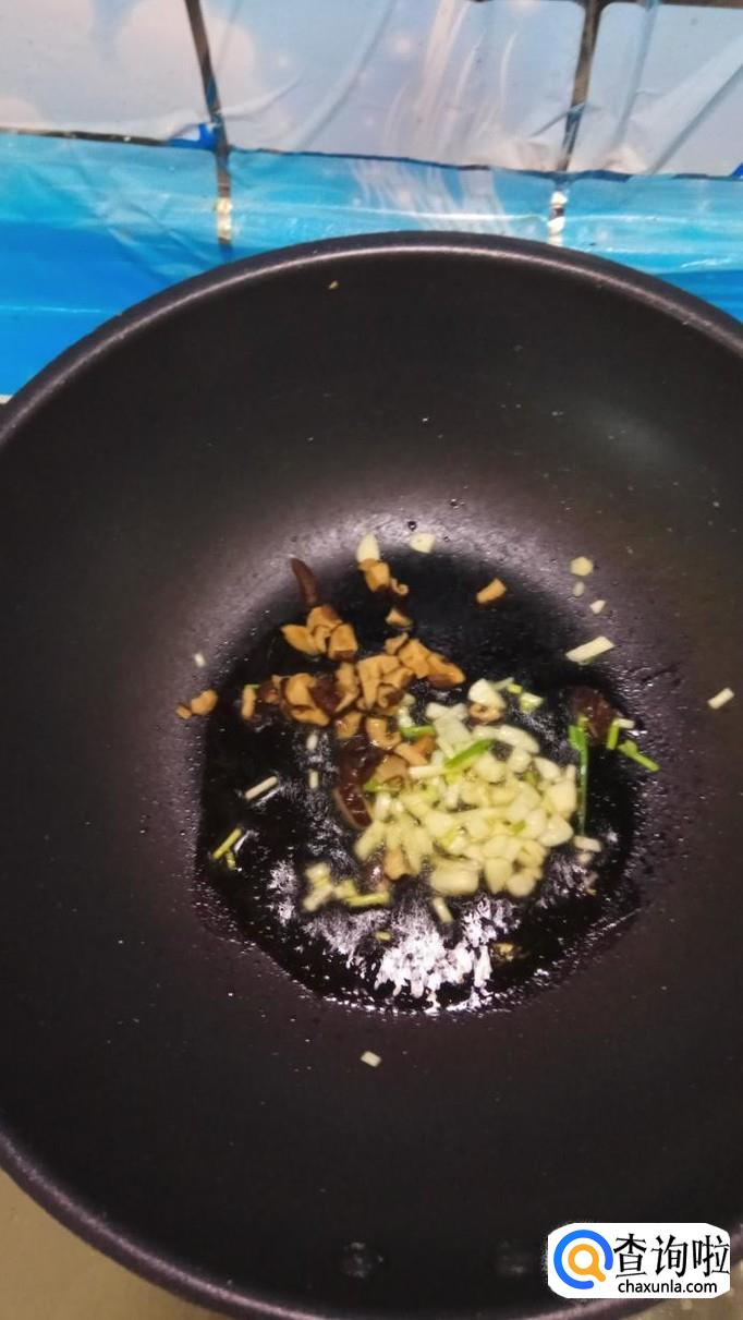 炒锅中放入适量油,油热后将香菇丁儿,葱末,蒜末一起放入锅中炒香。