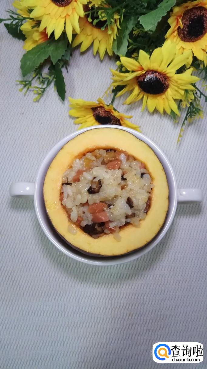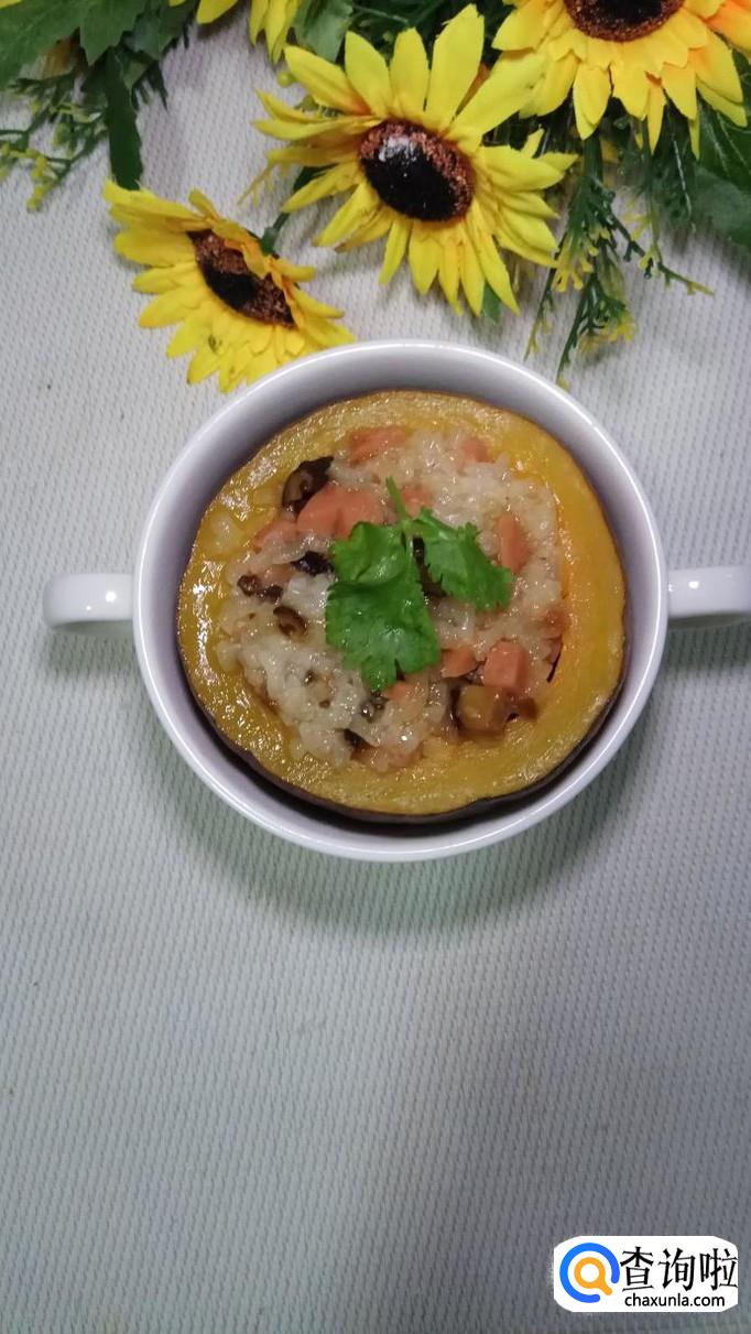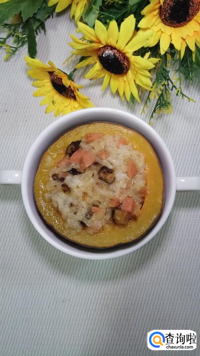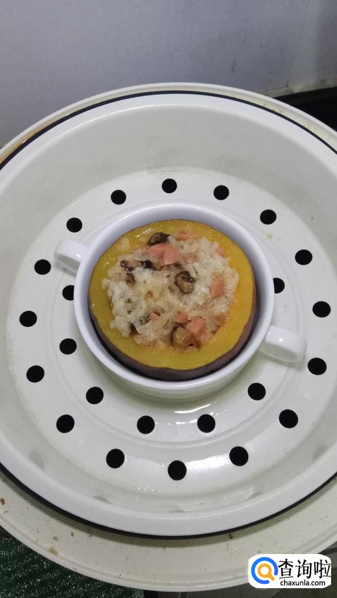 将做好的五香糯米饭,放在南瓜中间的洞里,然后放上蒸锅,再蒸15分钟左右。