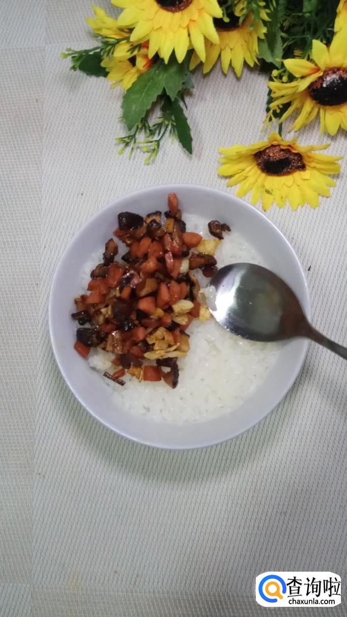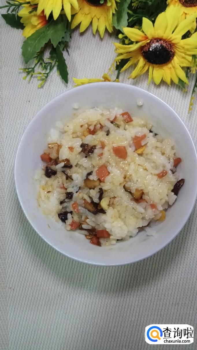 将炒好的香菇火腿,和蒸好的糯米放在一起,搅拌均匀。