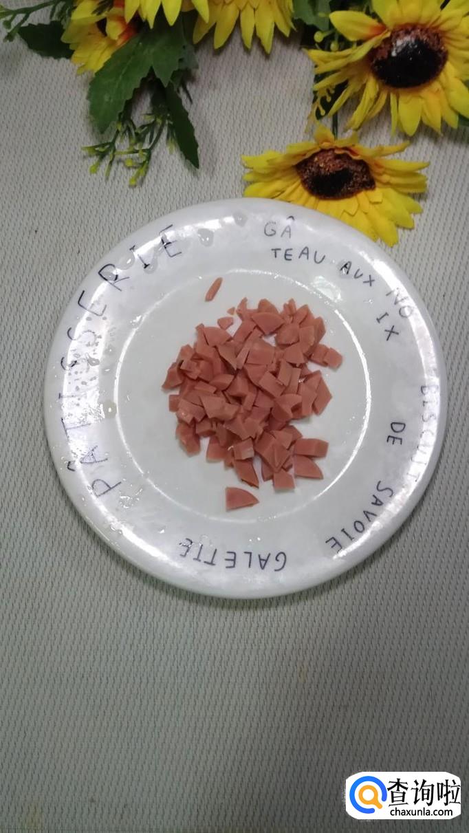 将香菇切成香菇丁,葱和蒜切碎,放入盘中备用,再准备一根香肠,去除外衣,切碎。