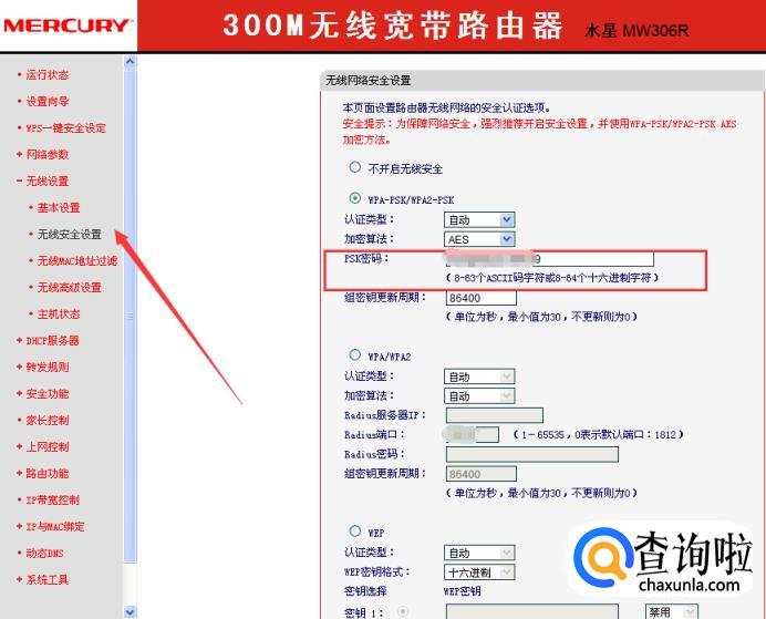 登录后,点击“无线设置”里的“无线安全设置”。在右侧就可以修改密码了,修改好后,重新连接上网吧。