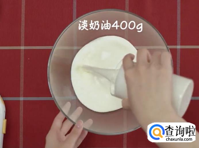 打奶油:在碗中倒入淡奶油400克,糖粉50克,用打蛋器将奶油打发备用。