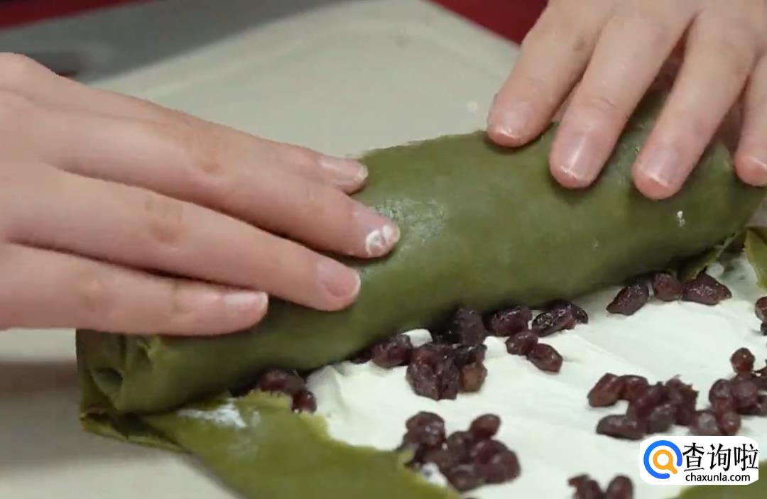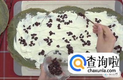包毛巾卷:将煎好的薄饼好看的那一面放在下面,三个叠放在一起;在薄饼上涂上一层奶油,放上蜜红豆;然后慢慢的将薄饼裹起来,裹成一个毛巾卷样式。