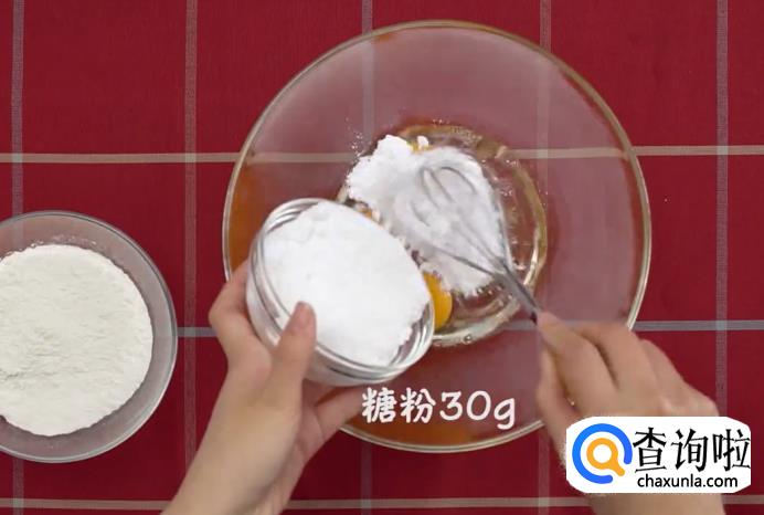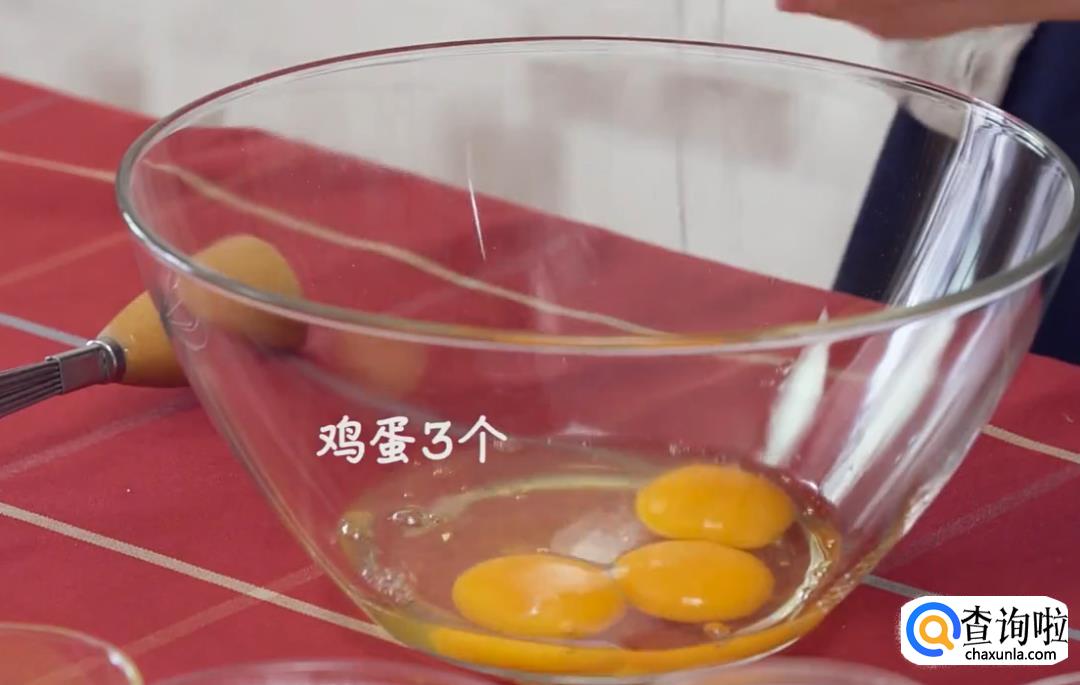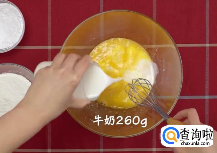 碗中放入鸡蛋3个、糖粉30克、牛奶260克拌匀。