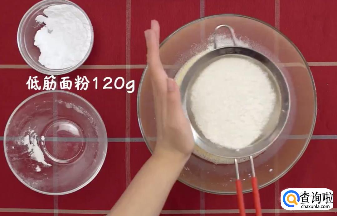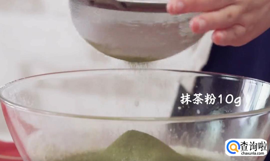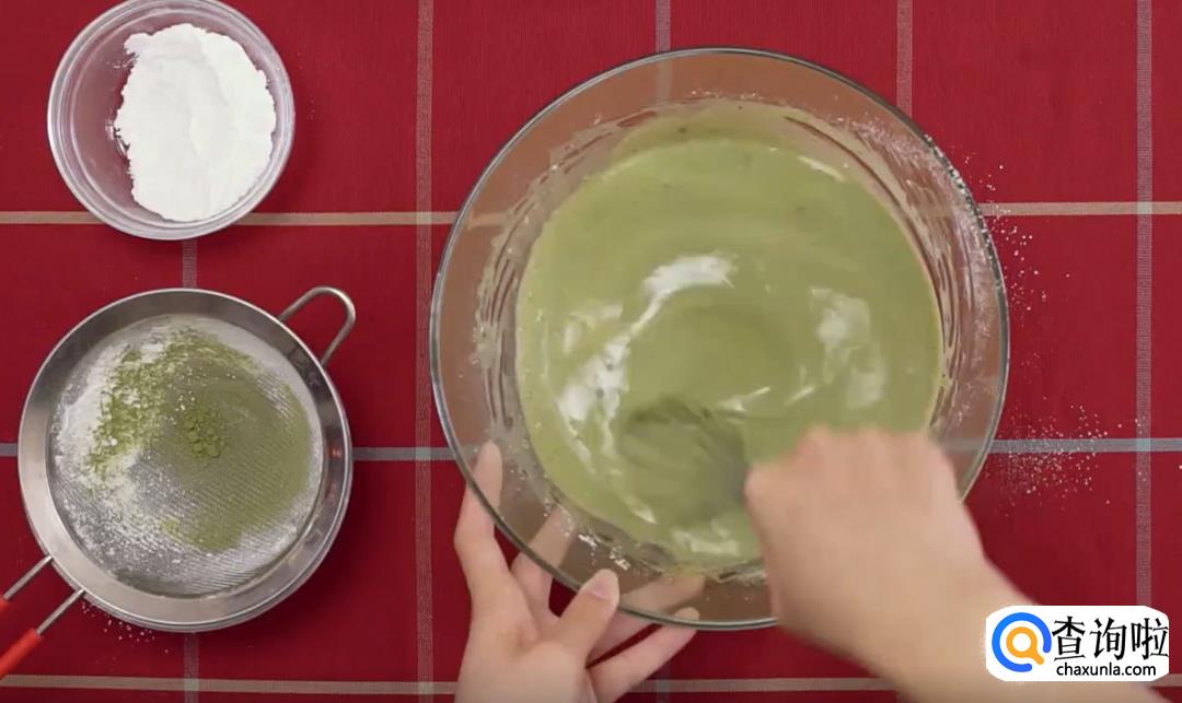筛入低筋面粉120克、抹茶粉10克拌匀。