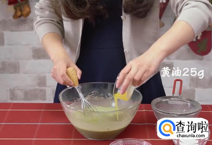 加入黄油25克,拌匀后将蛋液过筛;过筛后冷藏1小时。