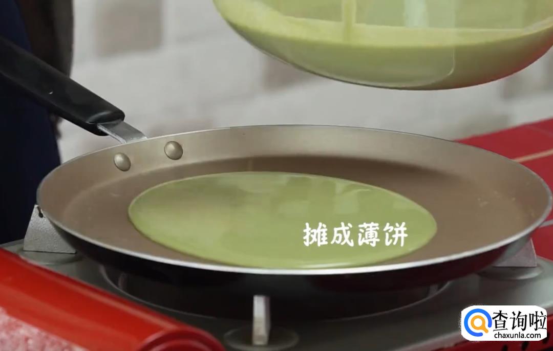 将适量蛋液倒入平底锅中,用小火摊成薄饼。