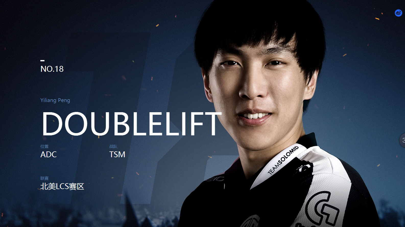 彭亦亮,男,1993年7月19日出生于美国,游戏ID为Doublelift,是一名美国《英雄联盟》电子竞技职业选手,原TSM战队ADC,现为Team Liquid战队英雄联盟分部ADC。