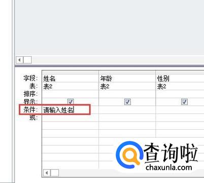在下方的表格“条件”一栏,输入对应需要查询的参数,例如下图:如果查找参数是姓名的话,就输入“请输入姓名”。