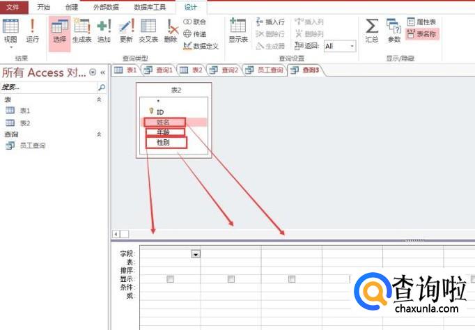 将表中的各个字段按顺序拖拽到下方的表格“字段”一栏,用鼠标点击选中然后直接拖就可以了。