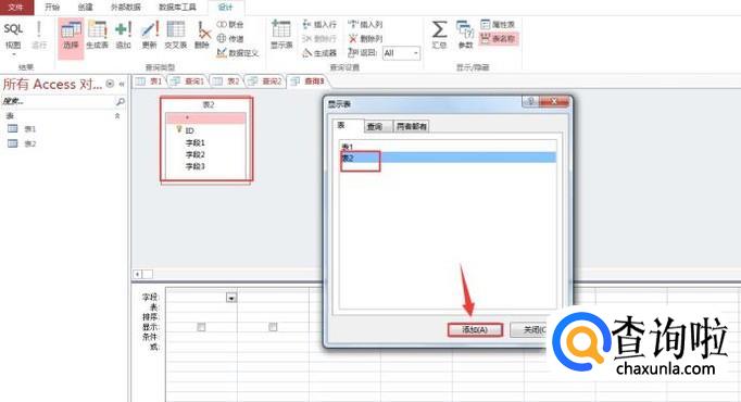 选择需要查询的表格,之后点击“添加”按钮,需要查询的表已经显示在屏幕上时再点击“关闭”或右上角的关闭按钮。