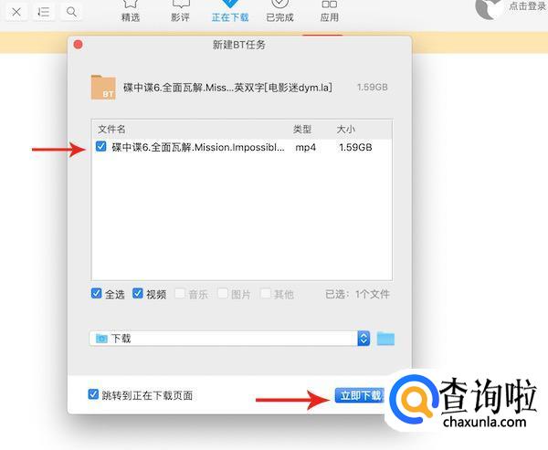 链接下载完成之后,会弹出影片资源信息提示框,确认影片内容和保存路径等,点击“立即下载”
