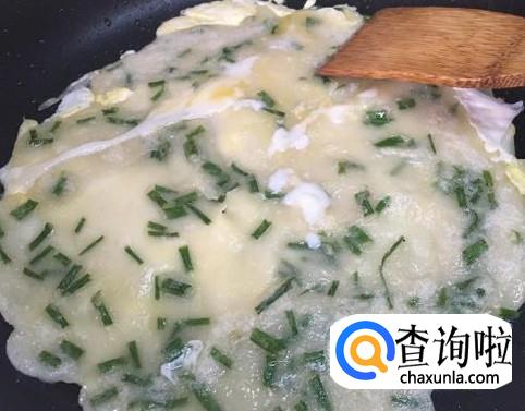 锅中放入食用油,只需放少许,把锅抹过来即可,然后倒入搅拌好的糊,用铲子把糊抹均匀,成一个薄片。