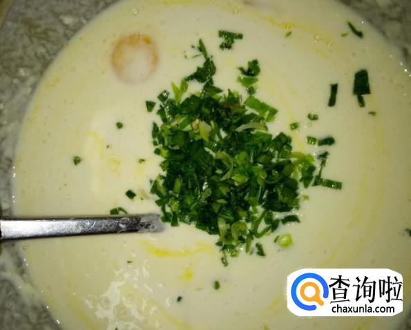 将鸡蛋打入碗中,面粉也放入碗中,兑上适量的凉白开水,再把韭菜和适量的盐放入碗中,一起搅拌成糊状,