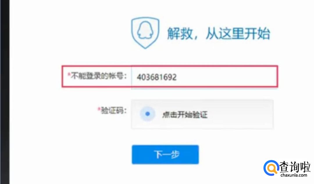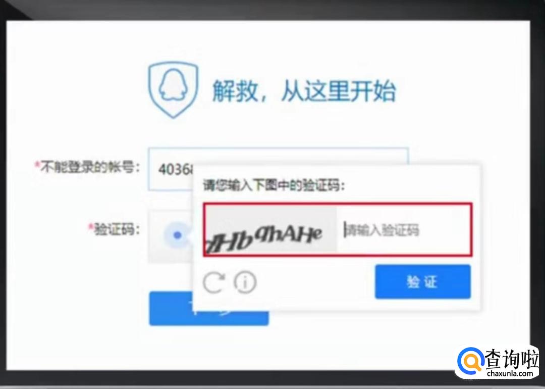 输入被封住的QQ号然后在弹出的窗格中输入相应的验证码,输入完成后点击下一步。