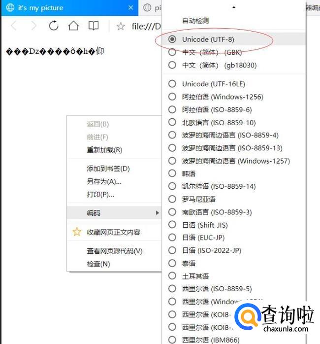 鼠标右键当前页面,查看浏览器的编码为Unicode(utf-8)