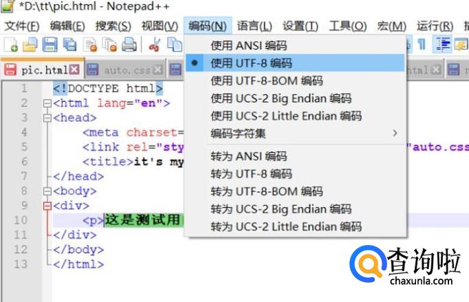 打开notepad++,新建一个HTML文件,选择编码里面的ANSI格式编写代码