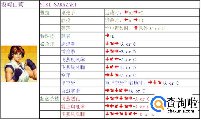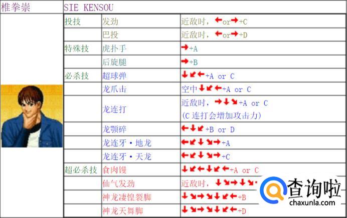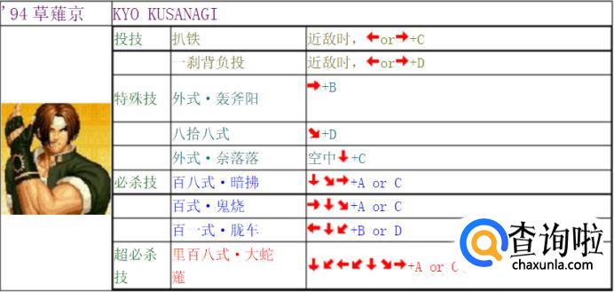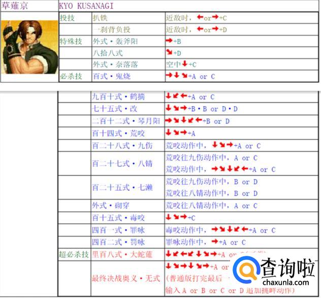 隐藏人物出招表:'94草薙京、暴走八神庵、暴走莉安娜。