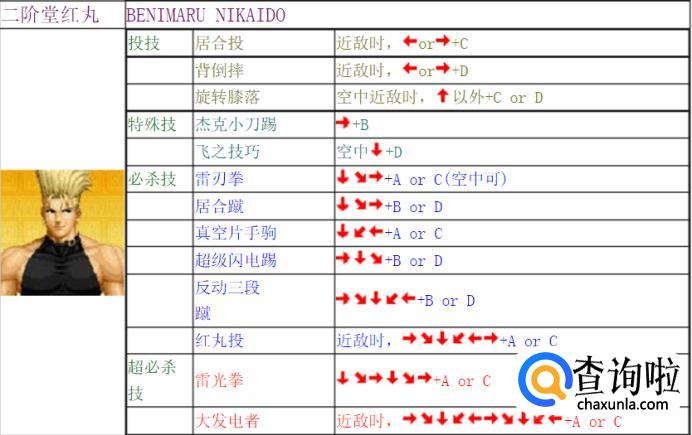 主角队出招表:草薙京、二阶堂红丸、大门五郎。