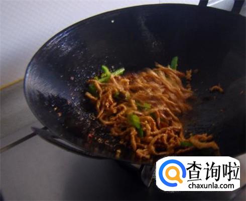 瘦猪肉切成丝,加上生抽、耗油和淀粉抓一抓腌制一下。锅里倒点油烧热,将肉丝放进去翻炒变色,加上葱姜末翻炒。
