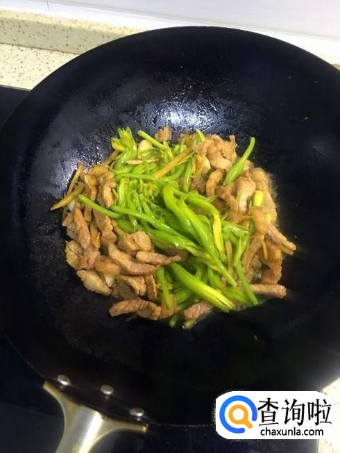 肉丝炒熟之后,将黄花菜放进去快速翻炒,然后加上一点食盐调味,切点青红椒放进去快速翻炒出锅。