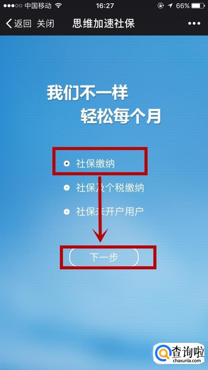然后会出现下放图片界面,选择:社保缴纳,点击:下一步,即可。
