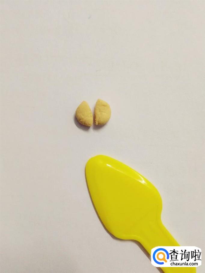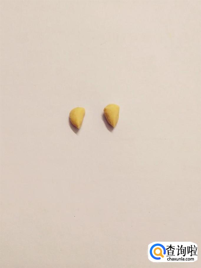 用一小块肉色捏成圆片,用小刀从中间切成两个半圆,粘在脸的两边,当作耳朵。