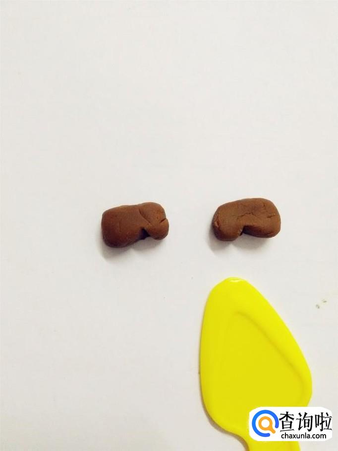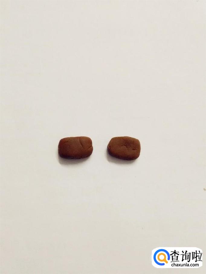 用两块棕色先捏成两个小方块,当作鞋。用小刀在小方块的底部各捅一下,分出鞋跟和鞋底两部分。