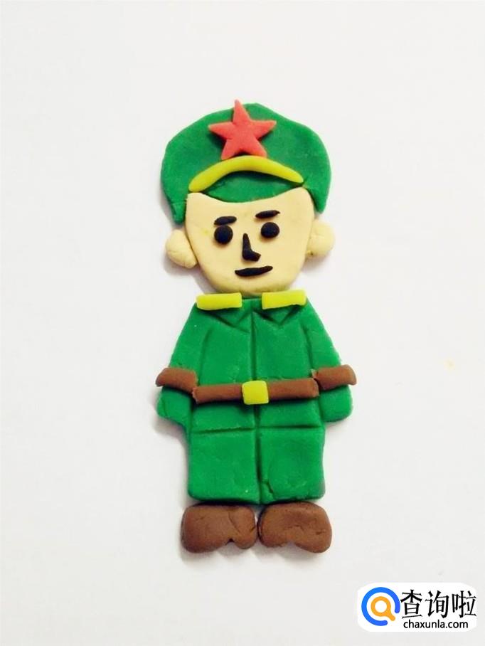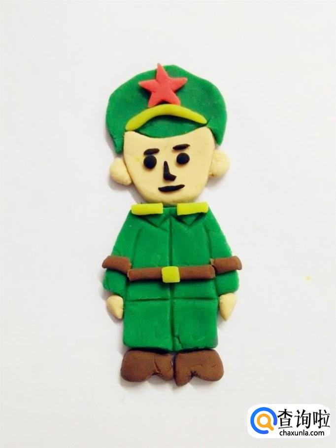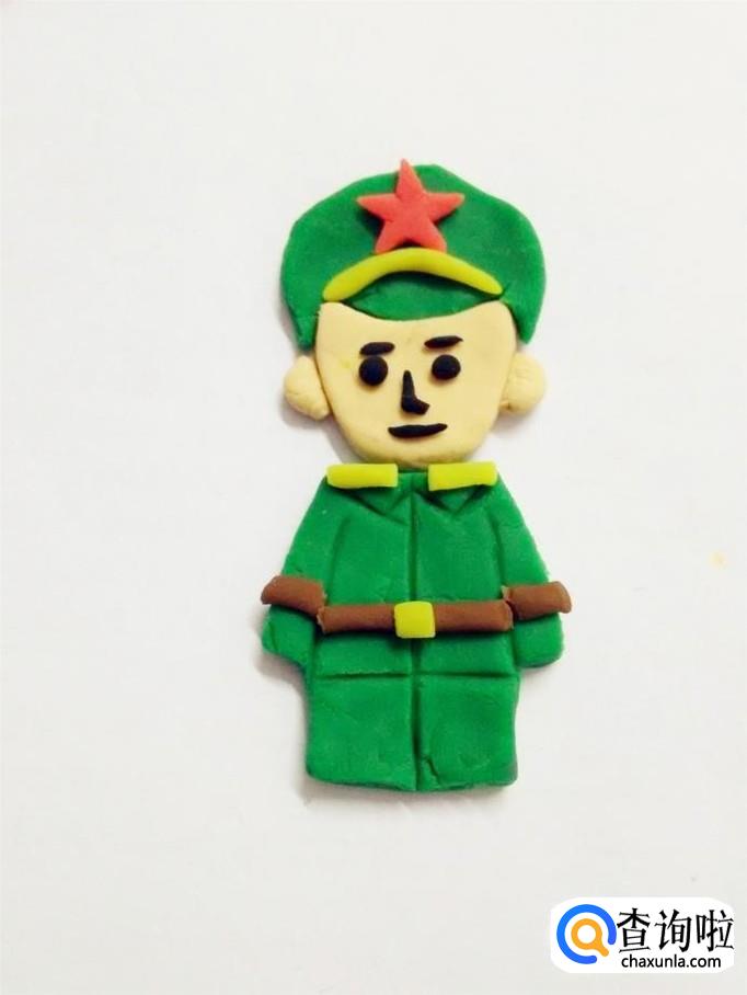 最后用肉色捏两个小三角形,当作军人的手,把两只手粘在袖口下面,一名军人就做好了。