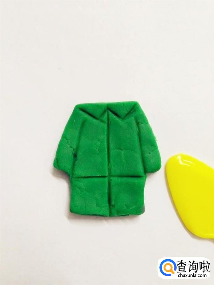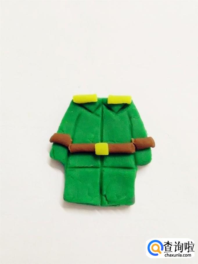 再用两小块黄色捏成两个小长方形,粘在肩上,当作肩章。