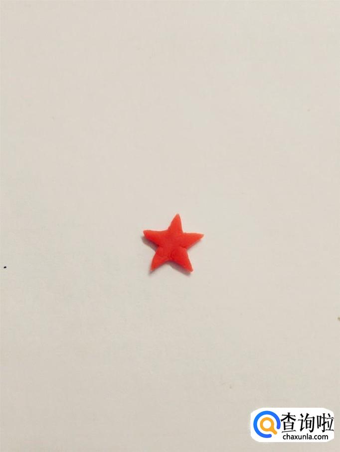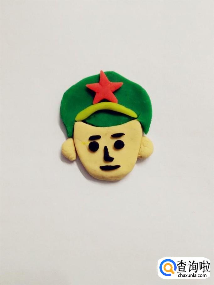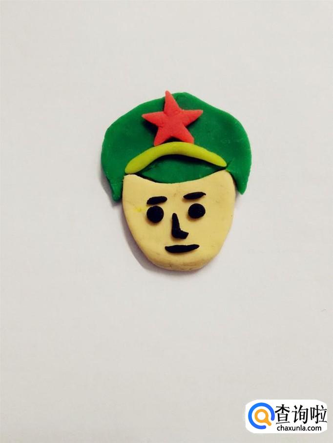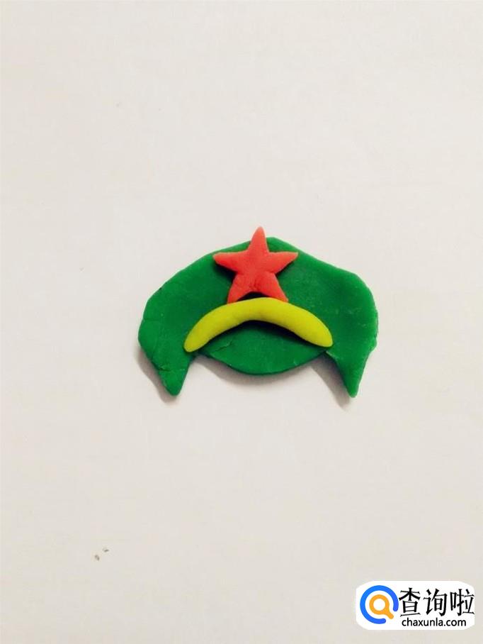 再用红色捏一个五角星,粘在帽子上面。