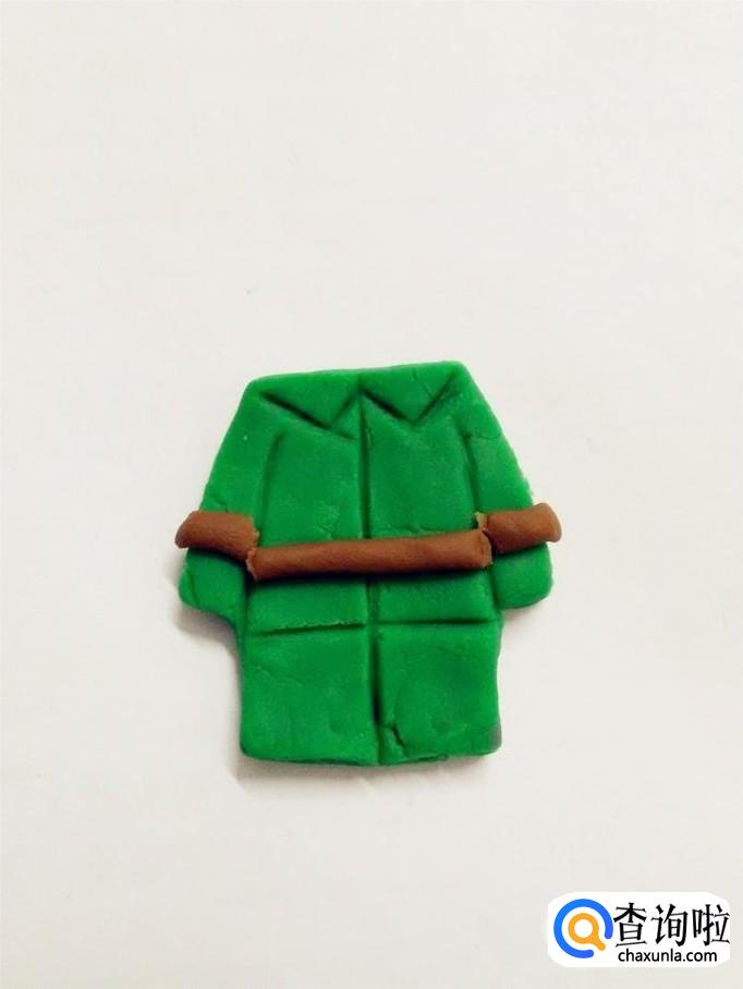 用棕色搓成一个长条,分成两短一长的三段,两段短的粘在袖子上,当作袖子上的横条,那段长的粘在正身上,当作腰带。