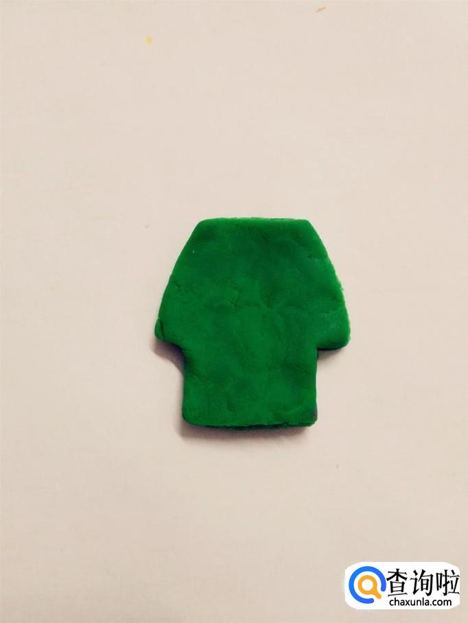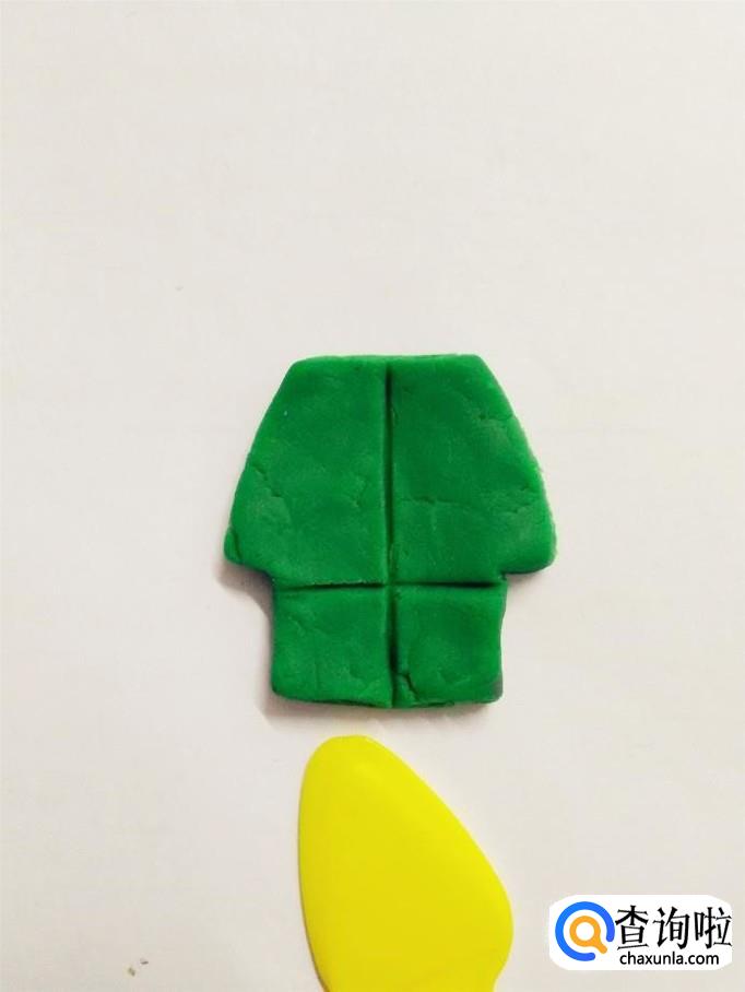 用一大块绿色捏成军人的身体,上面因为有胳膊,要宽一些。
