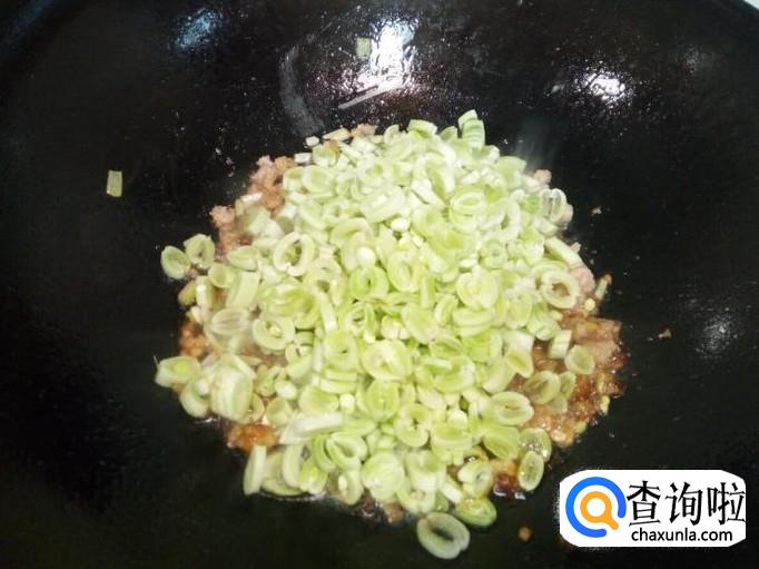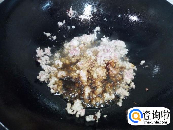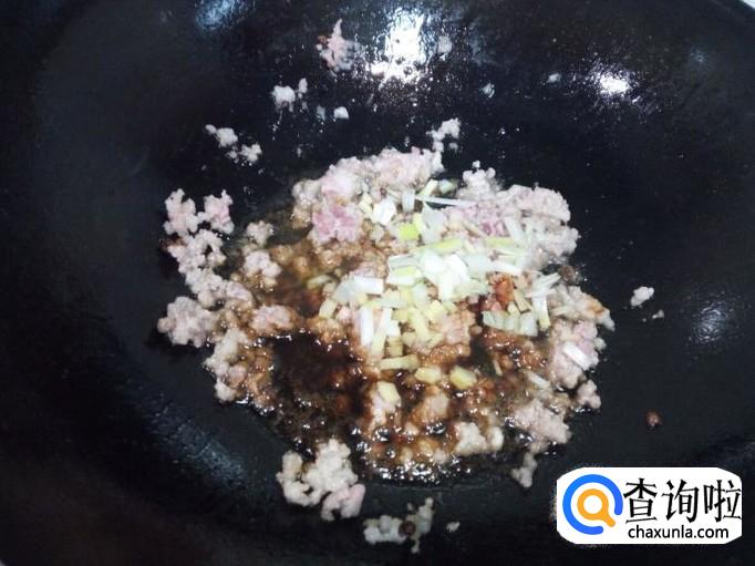 炒至肉末颜色微白,放入料酒,酱油,蚝油,放入葱,姜翻炒。
