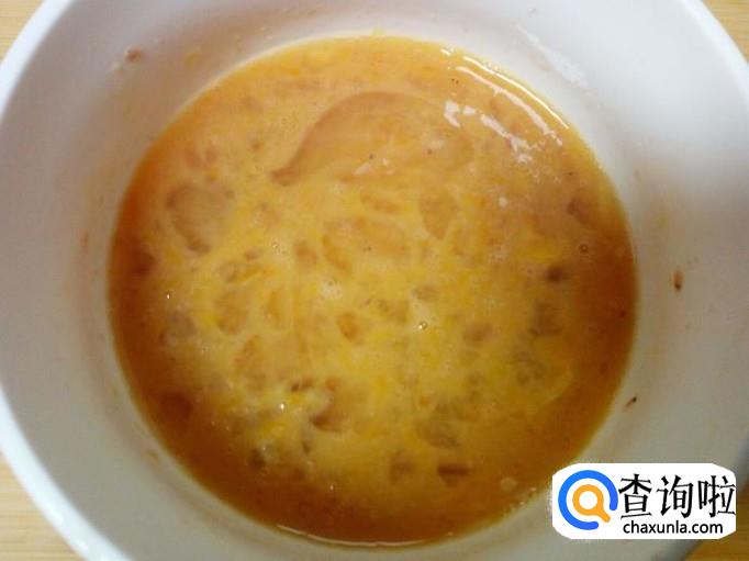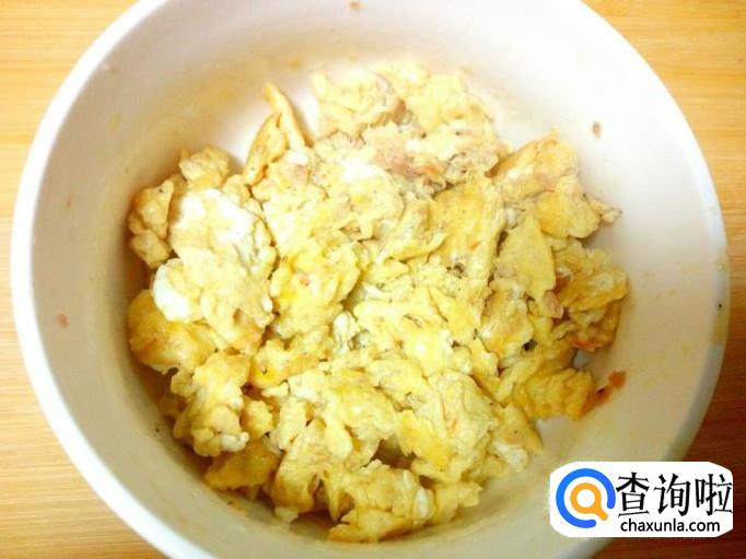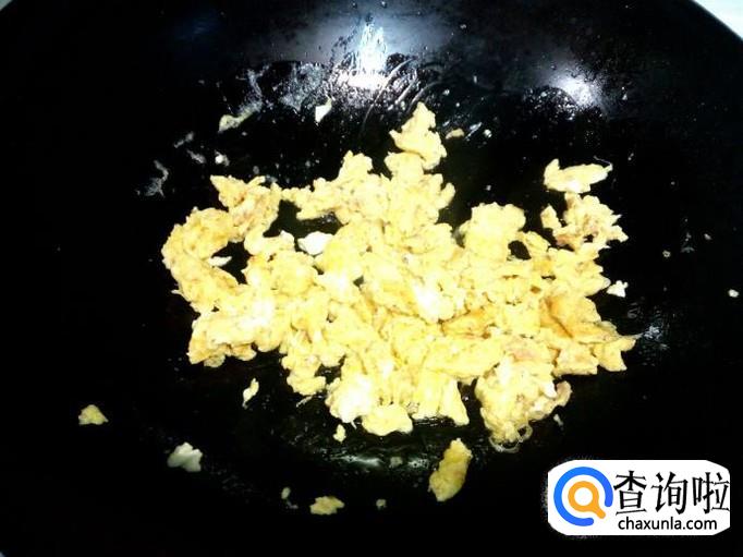 把虾酱鸡蛋液用锅炒出来,炒至七分熟,盛出备用。