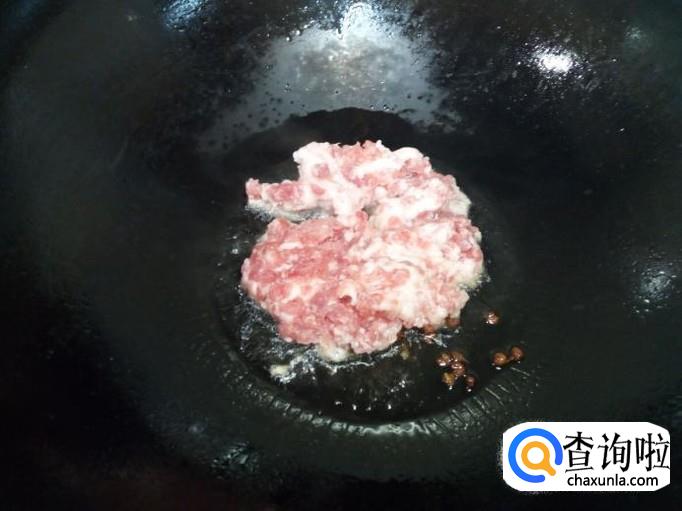 锅里放入油加热,油热后放入花椒爆锅,放入肉末小火翻炒。