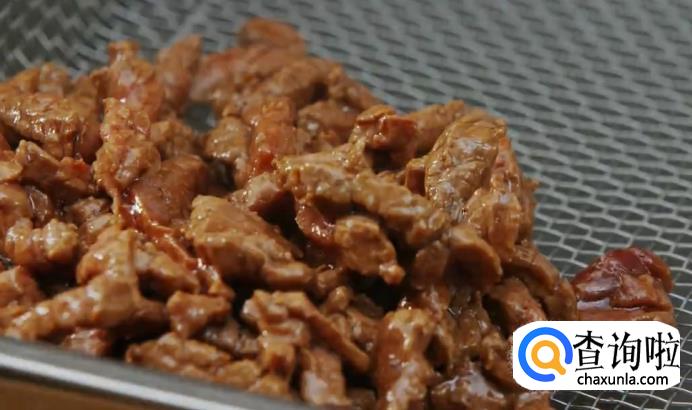 之后将腌制好的牛肉用少许冷油拌开,倒入锅中用筷子划散,等牛肉一变色马上捞出,沥油备用。