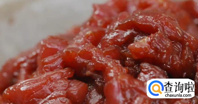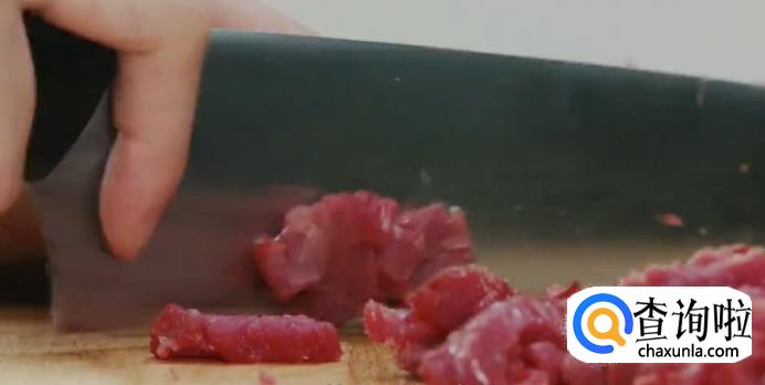 首先将牛里脊肉剃去白色筋膜,再从与纹理垂直的角度,将牛肉切成丝。