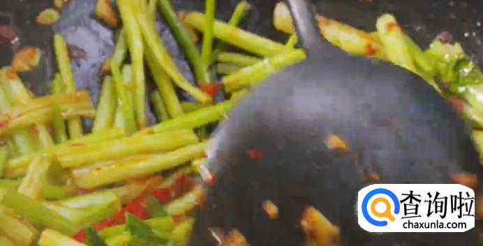 之后锅中留底油,开中火加热,下姜蒜爆香,放入红辣椒丝和一小勺郫县豆瓣酱炒匀,再放入芹菜转大火爆炒。